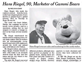Hans Riegel, the man who brought Gummi Bears to the masses, has died at 90. The New York Times says Riegel transformed his father’s small candy company into an international brand with 6,000 employees and more than $2 billion in annual sales. Haribo now makes more than 200 products, but none has proved to be as popular as the original Gummi Bear.