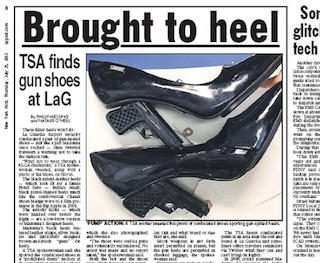 I know they look killer with your outfit, but maybe don’t wear your shoes with tiny fake guns as the heels to the airport. The New York Post says TSA agents at LaGuardia tweeted a photo of the gun shoes, which had been confiscated from a passenger, as a cautionary tale about what not to wear. The TSA also tweeted out a photo featuring a black belt adorned with silver bullets as example No. 2 of what not to wear through security.