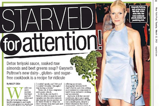 The New York Post’s take on the new sugar-free, gluten-free, dairy-free cookbook from Gwyneth Paltrow? It’s a “recipe for ridicule.”  The preface to “It’s All Good” begins with the actress’s retelling of a recent “sunny afternoon in London” when she thought she was going to die. Turns out it wasn’t a stroke but a migrane and a panic attack…and a book idea. “Good” retells the diet Paltrow’s doctor put her on for three weeks to get over the aforementioned migraine/panic attack. Recipes include “detox teriyaki sauce, soaked raw almonds, and beet green soup.”