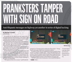 The Sun-Sentinel calls it “graffiti for the digital age.” Instead of warning drivers about an upcoming lane closure, someone reprogrammed an electronic construction sign on a south Florida highway to read: “No Latinos. No Tacos.” Apparently, instructions on how to pull off a sign switch are widely available on the Internet. The paper says a sign owned by the same company was hacked into last week in Phoenix. The sign was altered to show support for Arizona’s recent anti-immigration law, reading: “SB1070 Rules. Import illegals back to Mexico.”