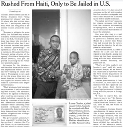 The New York Times has a story about a shameful outcome of the earthquake in Haiti. Some of the Haitians rushed out by airlift have been stuck in US immigration limbo for weeks. And some of them are stuck in detention centers because they don’t have visas. In response to questions from the Times, a spokesman for ICE said about 30 Haitian citizens being held in Florida detention centers were now ?being processed for release.?