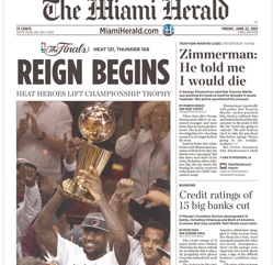 The king finally has his crown, says the Miami Herald. Two years after joining the Heat, LeBron James led his team to the franchise’s second NBA title and the first one on their home turf, beating the Oklahoma City Thunder last night 121 to 106. Columnist Greg Cote says “there was the implied promise of a dynasty when this Big 3 era began in the summer of 2010, and every dynasty must begin with a championship.”