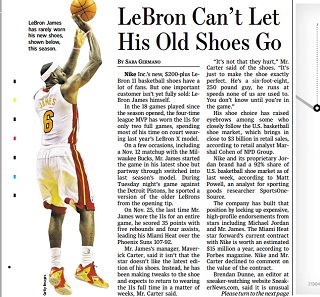 The 11th edition of LeBron James’ signature basketball shoes are selling like hotcakes - with sales up 18% so far this season over last year’s LeBron X model. But there is one customer who isn’t in love with them: LeBron James. The Wall Street Journal reports the four-time league MVP has only worn LeBron 11s for a full game twice this season. Mostly he wears last year’s model. LeBron’s manager says the shoes don’t quite fit right - but he expects James to be wearing them full time in a matter of weeks.