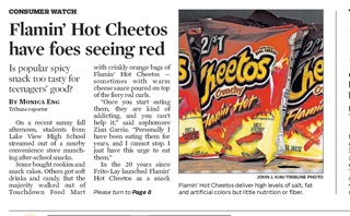 There is a front-page story in the Chicago Tribune this morning about Flamin’ Hot Cheetos, specifically their enthusiastic fan base in high schools all across America. Experts worry about the high levels of salt and fat but the Tribune says “there is something about Flamin’ Hot Cheetos that inflames critics in a way that other snacks —including regular Cheetos—never did.” As a result they’ve been banned in several school districts.