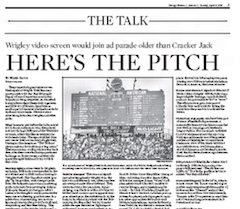 By now, you’ve probably heard about the controversy over the Wrigley Field renovation. The home of the Cubs and the second oldest major league stadium in the country is famous for the views available from nearby buildings. But a plan to put a giant new scoreboard in left field would not only put an end to the view, but also reneg on a 20-year contract signed by the team to legitimize the out-of-park viewing by taking a share of rooftop profits. This morning, The Chicago Tribune looks at the long history of ballpark billboards.
