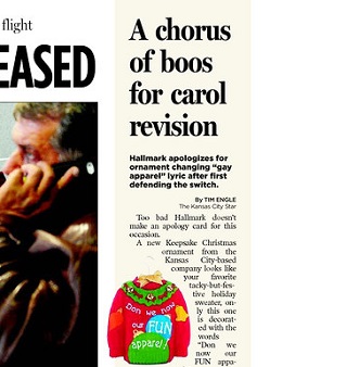 Hallmark is apologizing after being hit with a flood of criticism over a Christmas ornament. The keepsake looks like a Christmas sweater, with the words, “Don we now our FUN apparel.” Hallmark said the word gay, from the original lyric to “Deck the Halls” could be open to misinterpretation. The Kansas City Star says shortly after the controversy erupted in social media, Hallmark said in a statement it never intended to offend or make a political statement.