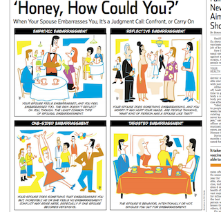 The Wall Street Journal has some advice for dealing with an embarrassing spouse in today’s paper. Psychologists say it’s pretty normal to wince occasionally at what your significant other is saying because they are seen as an extension of you. It’s only a serious problem when it happens chronically and is accompanied by fighting. And according to experts, there isn’t just one way to be embarrassed—there’s about four. From “reflective” embarrassment, when your spouse does something you find gauche, like raising their voice angrily in public, to “targeted” embarrassment, when one partner does something to intentionally embarrass the other.