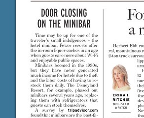 The Orange County Register says more and more hotels are pulling out their mini-bars. Despite the high prices of their items, hotel mini-bars were never big money makers due to the high cost of restocking and chronic theft. The paper says travelers these days care more about in-room Wi-Fi service and other amenities than they do having easy access to overpriced bottles of booze.