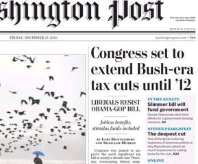 After much wrangling, Congress voted last night to extend the Bush-era tax cuts for another two years reports the Washington Post. President Obama ignored criticism from members of his own party who think the bill gives the wealthiest Americans an unfair break. The president told critics his intention was not to benefit the wealthy but rather to make sure middle-class Americans would not face any tax increases in the new year. After it’s signed into law, the bill will prevent virtually everyone’s taxes from increasing on January 1. It also provides 99 weeks of unemployment benefits for out of work Americans and includes several programs to stimulate the growth of small businesses. The tax bill passed the House, 277 to 148.