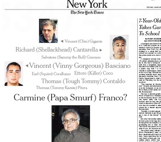 Yesterday’s arrest of Carmine Franco—better known as “Papa Smurf”—inspired the New York Times to look at the bizarrely entertaining world of mob nicknames. Several experts weigh in on how names like “Vinny Carwash, Tony Bagels and Junior Lollipops” develop. Often, they’re holdovers from childhood before anyone knows they’ll grow up to be a boss.