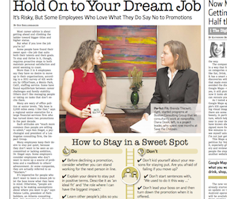 The Wall Street Journal has some advice on how to NOT advance in your job because you like the position you have. First of all, the Journal says make sure your reasons for staying put are legit, that you really love your job and aren’t just dodging a promotion because of a fear of failure. Next, let your bosses in on your decision as well as your reasons for wanting to stay in your current position, lest they think you’re just coasting.