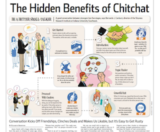Not everyone is born with the gift of gab, says the Wall Street Journal. But the art of chit-chat is an essential skill, albeit a dying one in the age of texts and video games. Experts say there’s no need to worry though—learning how to be a good conversationalist just takes practice. The most important thing to remember is to focus on the other person. Most conversations can be broken into five parts: starting off with a common observation—Hot enough for you?—is a good way to dive in.