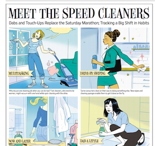 The Wall Street Journal says the newest generation of cleaners are built for consumers who “have a high tolerance for rooms that are works-in-progress—and a low tolerance for Saturday afternoon scrubbing sessions.” In other words, they are formulated to be fast. The Journal says “touch-up cleaning” now accounts for 70 percent of all household chores, up from 40 percent five years ago.