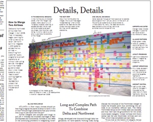 Imagine if your to-do list looked like this. According to the New York Times, this is the board at Delta Airlines HQ showing the steps necessary for merging an airline. Part of a merger’s complexity, says an airline executive, is that it can end up looking a lot like Noah’s ark, with two of everything.  Another problem is melding of two different cultures: “Delta always thought of itself as the gracious host. Hence its flight attendants poured the requested drinks. Northwest was the practical carrier; its attendants just handed over the can.” Then there are the thousands of little details—integrating customer loyalty programs, new airport locations, unifying computer platforms—that could really make someone’s head spin. (Click image above for a closer look at Delta’s Post-It note plan)