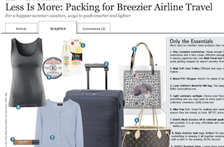 The Wall Street Journal has some good packing tips in this morning’s paper to ensure you never have to check (or lose) a bag again. The first thing to do is invest in a good bag. Tumi, Globe-Trotter and Muji are all brands singled out for their lightweight yet roomy designs. Next, pare down your pile to only the essentials and pack only those. No need to pack an outfit—or six—for every situation your vacation might through at you.