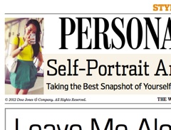 The Wall Street Journal has some good advice on how to take a decent self-portrait. As with most photos lighting is important. Try to find some natural light or, in a pinch, “a soft but potent artificial source.” To appear slender, try cocking your hip towards the hand you’re holding the camera with while simultaneously jutting the other shoulder forward.