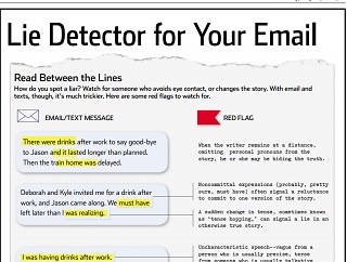 With no body language to decipher, it can be difficult to figure out when someone is lying to you online or in an email or text message. The Wall Street Journal suggests using a modified version of a law enforcement technique called statement analysis. Pay attention to a person’s use of emphatic language. Also watch out for unanswered questions and noncommittal statements.