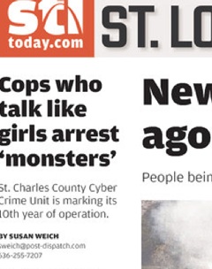 A headline in today’s St. Louis Post-Dispatch caught me eye this morning: “Cops Who Talk Like Girls Catch Monsters.” The story is about police officers—in particular, a 6-foot-5, 300-pound, ex-Marine with a bushy red beard—who impersonate teens online to catch pedophiles. Officers say they keep cheat sheets near them so they can quickly figure clothes sizes or teenage girl topics like “bras and birth control.” A pack of Post-It notes is also kept close at hand to be placed over body parts on X-rated websites.