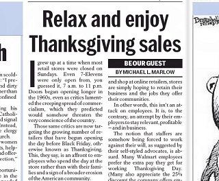 Michael Marlow, an economics professor, has a guest column in the Daily News where he argues that stores opening on Thanksgiving are just trying to compete with online retailers like Amazon who are open 24/7. It’s not an attack on families, but an attempt to stay relevant and remain in business. He also says many employees are just fine with the notion of working on Thanksgiving.