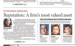 San Jose Mercury News columnist Michelle Quinn says the NBA’s quick decision to oust Clippers owner Donald Sterling is the latest illustration of the importance of reputation in the era of social media. With Twitter trolls ready to pounce at any misstep, companies can’t afford to wait to address sensitive issues. Three CEOs of firms not used to being in the spotlight, Mozilla, GitHub and RadiumOne all resigned or were booted after their actions became fodder for Twitter.