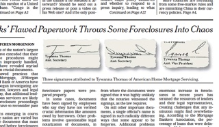 Anyone who’s ever faked a note from their parents knows that consistency is key. Take a look at the three signatures on the front page of the New York Times this morning. Supposedly, the same mortgage company employee signed all three. Similar inconsistencies have popped up on thousands of documents, indicating that a wide swath of foreclosure proceedings stemming from the financial crisis were improperly handled.
