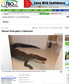 What’s the last thing you’d like to see making itself at home in your bathroom? A seven-foot alligator, perhaps? That’s exactly what a Florida woman discovered when she returned home this weekend. The Tampa Tribune says the gator made his entrance through a doggie door and spent several hours wreaking havoc before being discovered. The woman says the house had been ransacked by her reptile intruder (“My furniture was all moved around; my blinds were all discombobulated.”) but she was lucky to find her prize possessions—two cats—shaken up but unharmed.