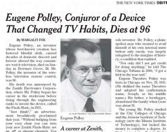 Eugene Polley died over the weekend at the age of 96. You might not know his name, but chances are your life has been affected by his work. Polley invented the TV remote control back in 1955, which he called the “Flash-Matic.” A New York Times obituary says his invention “fostered blissful sloth, caused decades of domestic discord and forever altered the way consumers watch television.”