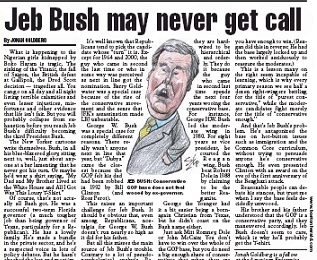 National Review Online Editor Jonah Goldberg pens an opinion piece in the Boston Herald on why Jeb Bush likely won’t be the third Bush to occupy the White House. Goldberg says contrary to popular belief, the GOP chooses a candidate whose “turn” it is, not out of a sense of loyalty or order but because that candidate often spends a lot of time wooing the conservative base. Goldberg says Jeb Bush has instead been antagonizing the base on hot-button issues.