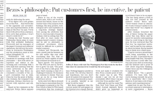 Jeff Bezos gives his first interview since acquiring the Washington Post last month…in this morning’s Washington Post. The Amazon.com CEO says he’ll use the same tactics he employed at the e-commerce site to bring about a “golden era” at the newspaper. He gives credit to three ideas for making Amazon so successful: “Put the customer first. Invent. And be patient.” Bezos says thinking of readers as customers will help to bring change to the flailing newspaper industry.