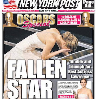 The New York Post skips the night’s Oscar winners and gets right to the embarrassing stuff on its front page this morning. That’s Best Actress winner Jennifer Lawrence covering her face after tripping on the way to the stage to receive her statue. After picking herself up quickly, her tumble (and presumably her win) received a standing ovation, to which the 22-year-old actress responded: “You guys are just standing up because you feel bad that I fell.”