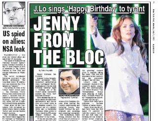 Jennifer Lopez is “Jenny From the Bloc” in this morning’s New York Post after the singer performed for Turkmenistan’s authoritarian ruler over the weekend. Lopez donned a traditional Turkmen outfit to sing a “Marilyn-JFK-esque” rendition of “Happy birthday, Mr. President” to Gurbanguly Berdymukhamedov, whom the Post refers to as “one of the world’s most oppressive leaders.”
