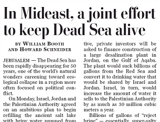 The Washington Post reports on the joint effort by Israel, Jordan and the Palestinian Authority to refill the shrinking Dead Sea. Investors will fund a massive desalination plant in Jordan that will purify water from the Red Sea. The converted drinking water will be shared by Israel and Jordan, with Israel agreeing to sell some of it to the Palestinian Authority. The excess salt water created will be dumped back into the Dead Sea.
