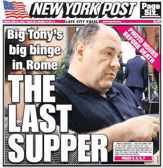 The New York Daily News and the New York Post put the same photo of James Gandolfini on their front pages this morning, snapped hours before the actor’s death. Tourists who caught sight of Gandolfini eating at an Italian restaurant in the hours before his fatal heart attack say he looked happy and healthy and seemed to be enjoying himself.