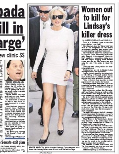 A little notoriety goes a long way. The New York Post says the short white minidress Lindsay Lohan wore to court has already sold out. The Post says Lohan took to her Twitter account to express her incredulity that wearing a short, tight, white dress to court would make such a media stir: “What i wear to court shouldnt be front page news. it’s just absurd.” Many questioned whether Lohan’s courtroom outfit, which called to mind Sharon Stone’s infamous “Basic Instinct” getup, was appropriate. Designed by Kimberly Ovitz, it sells for $575.