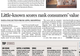 The Sacramento Bee has an interesting look into the thousands of scores businesses use to rank consumers. From customer loyalty to purchasing power, so-called e-scores or predictive scores are used by companies to determine everything from which coupons to send you to how easy it will be for you to open a bank account. These scores have drawn scrutiny since they aren’t regulated by the government, and unlike your credit score, you have no legal right to see how you’re ranked.