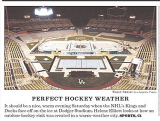 The NHL has been staging games outdoors for several years now. But Saturday, the Los Angeles Kings and Anaheim Ducks will square off at Dodger Stadium, where the temperature during the day is expected to reach 80 degrees. The Los Angeles Times says advances in refrigeration technology and game-time temperatures in the 50s should make for a playable surface. The New York Rangers and New Jersey Devils face off Sunday at Yankee Stadium, where temperatures will be in the 20s.