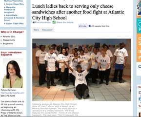 The ladies employed the same punishment back in April, a story that went on to become international news. It also inspired the school’s art teach to provide a drawing of a smiling cheese sandwich for a t-shirt emblazoned with the slogan, “A.C.H.S. Home of the Cheese Sandwich.” On the back of the shirt was a message the school’s student surely know by now: “Don’t mess with the lunch ladies.”