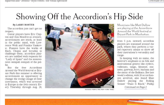 “Showing Off the Accordion’s Hip Side” is the headline in today’s New York Times. My question: which side is hip? All sides, according to a festival going on in Manhattan this summer. The purpose of Accordions Around the World is to stage a makeover for the accordion’s image and change people’s perception that it’s just a stodgy 19th century instrument. Artists enlisted to help with the transformation are eschewing the polka for non-traditional choices like the Rolling Stones and Bob Marley.
