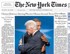 An embrace between Bill Clinton and President Obama dominates the front page of the New York Times this morning but a “Man in the News” profile is all about the president. On the eve of his appearance at the DNC, the Times writes: “If Denver was all about promise, Charlotte is all about patience. Whether Americans grant the 44th president a four-year extension will depend in part on his ability to reconcile the heady aspirations of 2008 with the messy results of the four years that followed.”