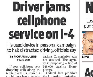 Being against distracted driving is good. Using a cellphone jammer to prevent fellow drivers from being distracted? Well, that can get you in big trouble with the FCC. The Tampa Tribune says the Federal Communications Commission is proposing a $48,000 fine against a man who used a cellphone jammer for two years during his daily commute along Interstate 4 in Florida. Investigators say not only would a device like that block cell phone signals, but it would also block communications among emergency responders.