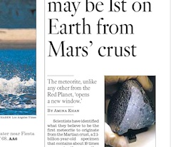 Scientists are buzzing about a a 2.1-billion-year-old Martian rock which was recently found in the Sahara Desert, reports the LA Times this morning. Unlike other specimens from the planet, the meteorite appears to be from the crust of Mars and has given “an unprecedented close-up view of the Martian surface.” Researchers have named the rock “Black Beauty,” because it is uncharacteristically dark through and through.