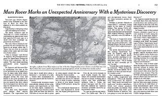 It was supposed to be a 3-month exploration. But 10 years later, NASA’s Opportunity rover is still roaming the surface of Mars, making discoveries. The New York Times says instead of the planned one kilometer, Opportunity has traveled nearly 39 (or 24 miles). 10 years later, it still comes up with new discoveries, like a “jelly doughnut” rock that was not there when Opportunity passed the same spot two weeks earlier.