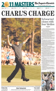 Oh, by the way, Charl Schwartzel won this year’s tournament. The Augusta Chronicle says four consecutive birdies helped the South African “rise above the mayhem and win a green jacket.”