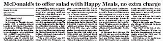 Hold the fries. McDonald’s is making plans to offer side salads, at no extra charge, with its value meals starting next year. The company is also planning to promote only water, milk and juice as part of its Happy Meals, although soda will still be an option. McDonald’s says more healthy changes are on the way. An outside company is being brought in to track the progress of the new health initiatives.