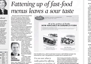 What’s Subway doing selling falafel? Chicago Tribune columnist Steve Johnson is worried about a trend he sees on the horizon, namely that “too many of America’s fast-food emporiums are failing to stay in their place.” Even Noodle & Co., “which would seem to have a pretty well-defined concept,” has introduced sandwiches to its menu. One of Johnson’s favorite chains is Chipotle, for their purposefully myopic mission statement. I have to agree—they do what they do quite well. And honestly, it’d probably make me uncomfortable to see a burger on the menu. That, it seems, is Johnson’s point.