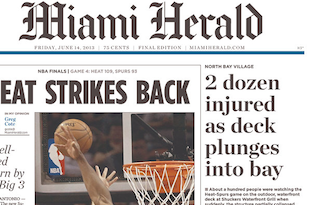 A deck collapsed at a Miami sports bar last night dumping dozens of NBA fans into the water below and injuring at least 24 people. Witnesses told the Miami Herald that “there was just a crack, and then we were in the water.” The water was shallow enough to stand in but it was hard to make an exit because it was crowded by tables, chairs and wood from the collapsed deck.