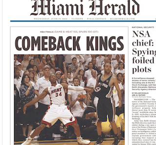 There’s a great photo on the front page of the Miami Herald this morning showing the Heat’s Ray Allen watches his three-point shot go in as he holds on the the jersey of opponent Tony Parker. The Heat muscled their way back during overtime last night, eking out a 103 to 100 win over the Spurs and forcing a seventh game. The Herald says last night’s game will be remembered as “the night Ray Allen bailed out LeBron James and Dwyane Wade.”
