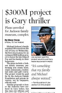 If you’ve ever driven through Gary, Indiana, you know that it could stand a face lift. And now it’s getting one. The Chicago Tribune says Michael Jackson’s family just purchased 300 acres on which they plan to build a museum to the late King of Pop. Organizers say the $300 million project would pump about $150 million into the economy each year. Construction is slated to begin next year.