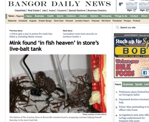 Some things are worth swimming for, even in a fur coat. Maine’s Bangor Daily News says an intrepid mink managed to get loose at a local pet store and make his way into a fish tank housing live bait. The store’s owner snapped the above photo after catching the “sopping-wet mink enjoying a smorgasbord.”