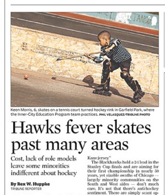 The Stanley Cup finals are underway, with Chicago and Philadelphia competing for the title, but the Chicago Tribune says large parts of the city’s population are immune to “Blackhawk fever.” The paper says in minority communities there are few opportunities to learn about or play hockey. And an absence of minority players in the NHL makes it hard to relate. Currently the league has only 18 black players and three Hispanic ones. The NHL is trying to change the perception that the sport is only for whites with its initiative, Hockey is for Everyone.